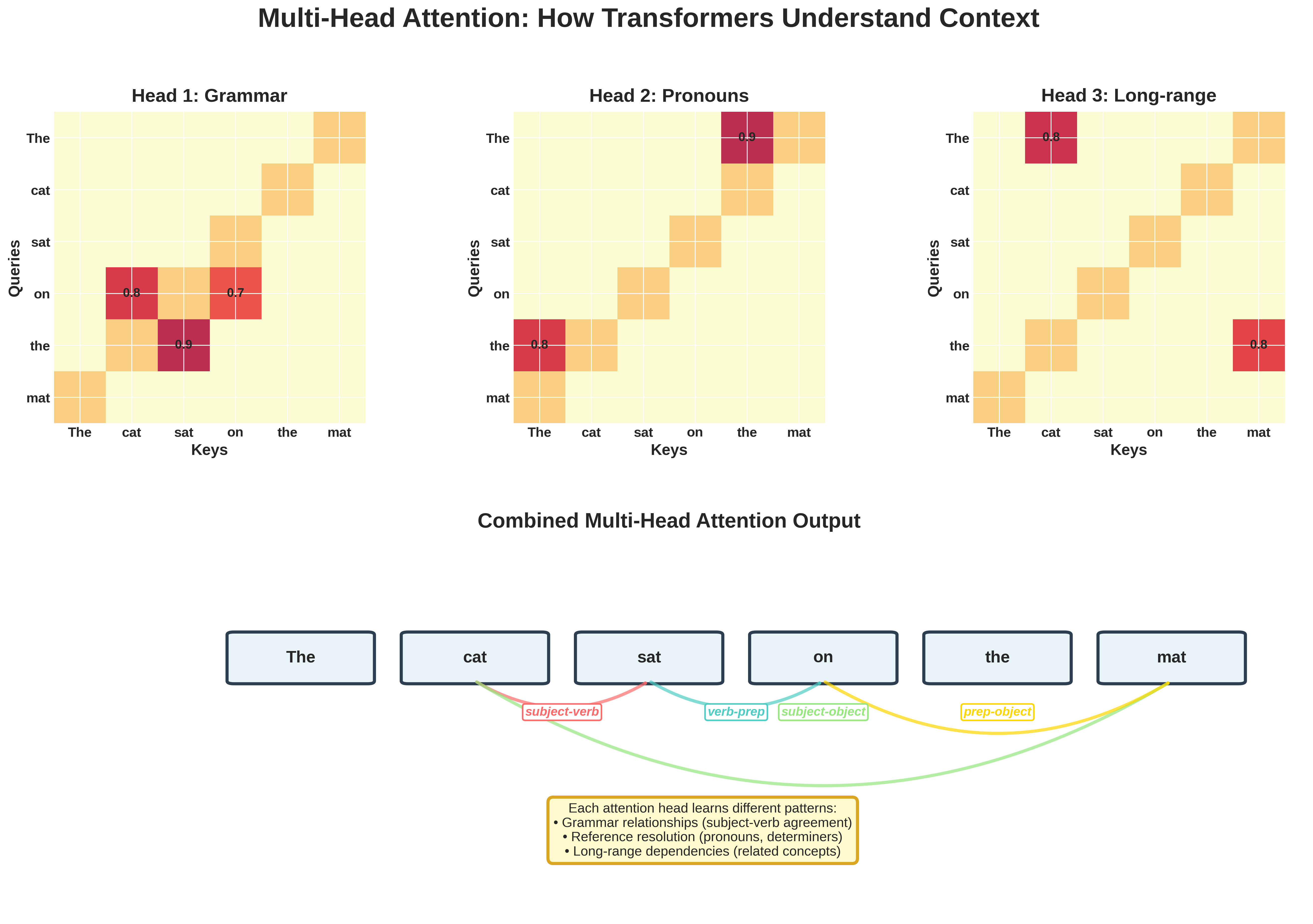 During Training: These matrices learn to extract different types of relationships - some heads learn syntax, others semantics, some long-range dependencies, others local patterns.