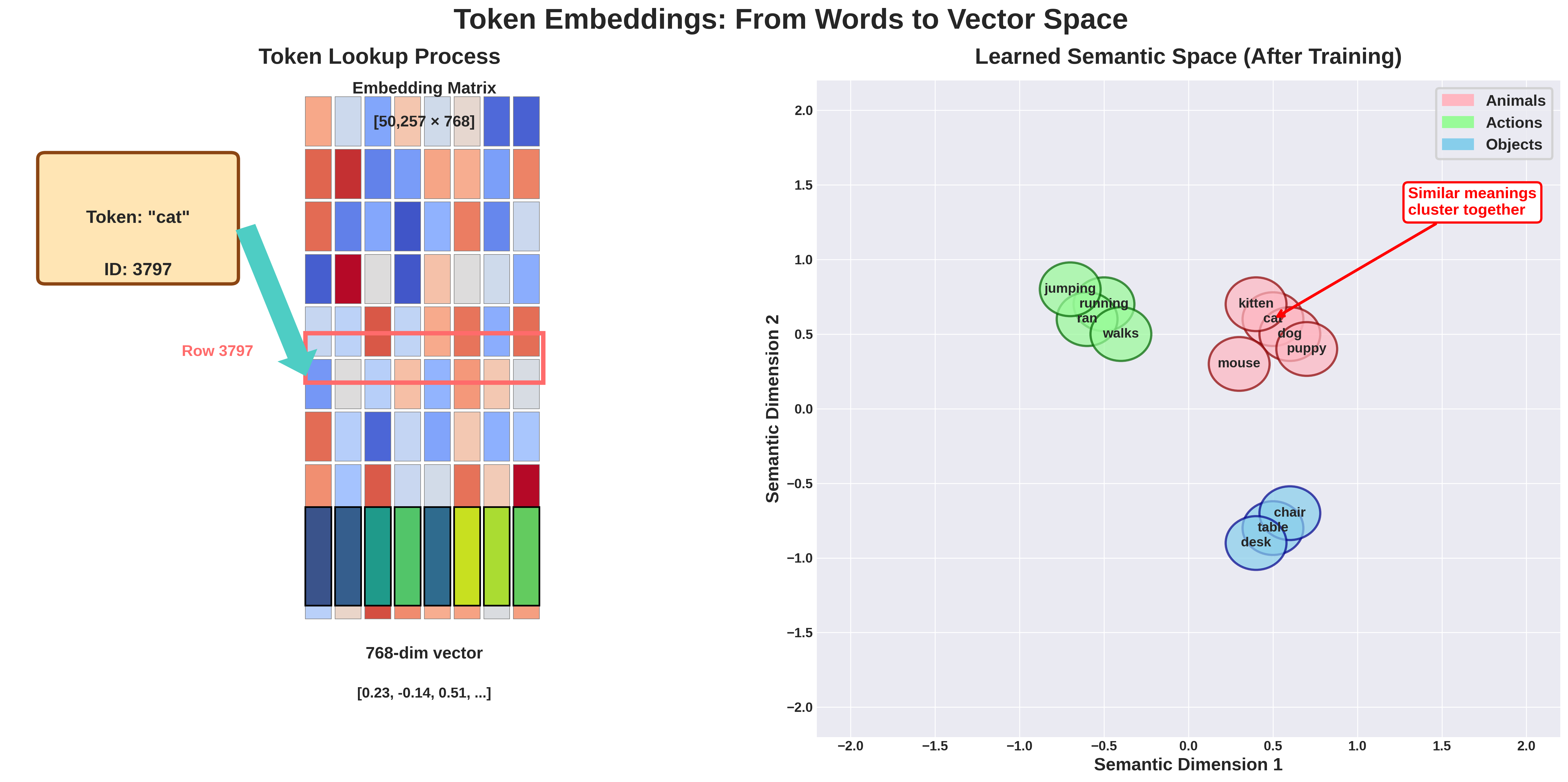 Training Evolution: These 38.6 million parameters start random but gradually organize into a meaningful semantic space where related concepts cluster together.